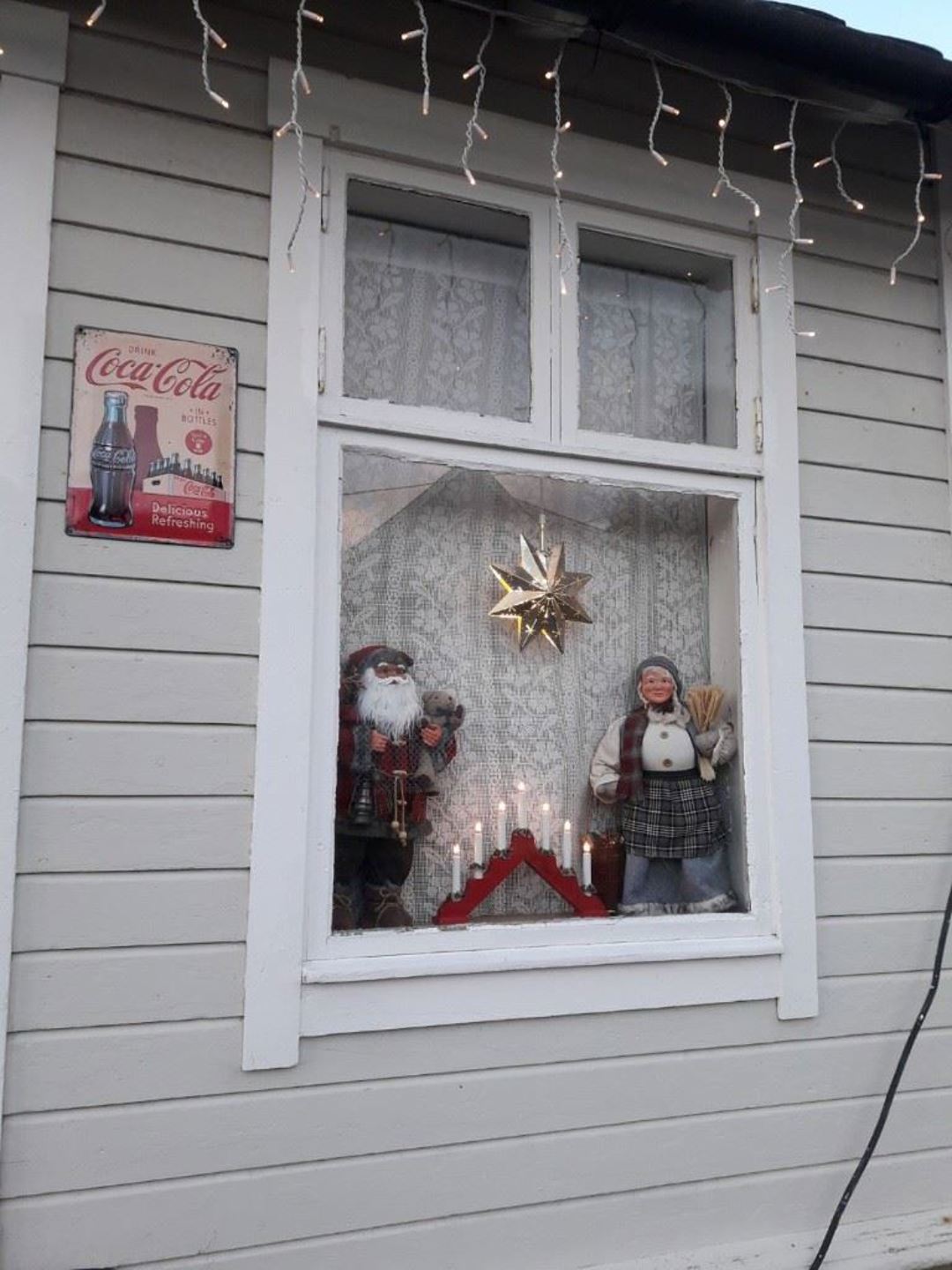 Fint å se julepynta vindu der nissene
